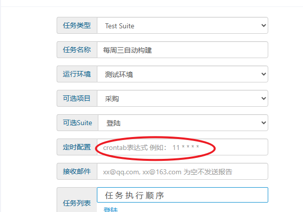 根据图片中的“定时配置”字段提示:“crontab表达式 例如:11 * * * *”,可以推测红框内应该填写的是一个 crontab 定时任务表达式,用于指定任务执行的时间。